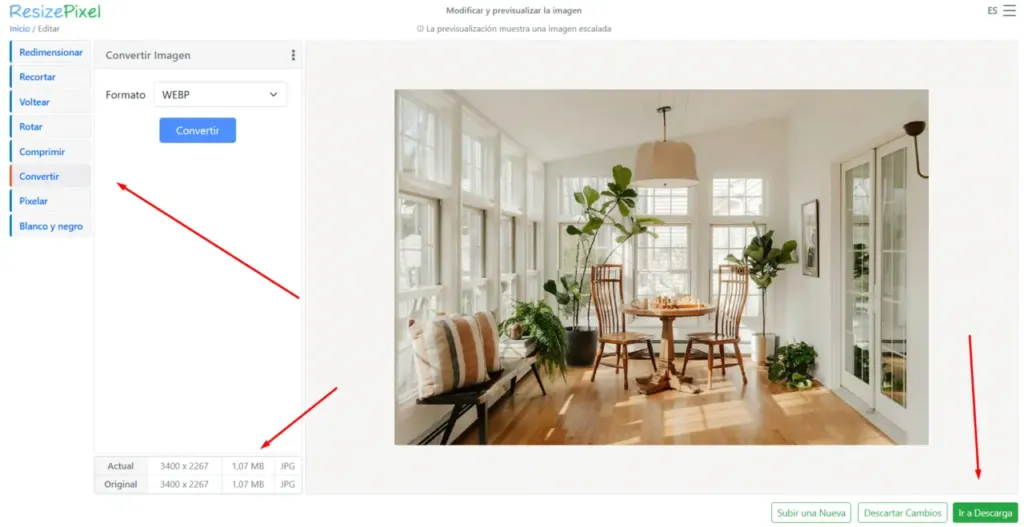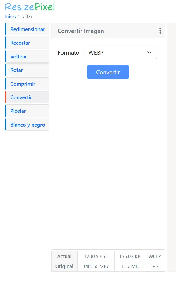 Maravilloso, la imagen bajo aun mas su peso, por ultimo vamos a cambiar el formato que es JPG, vamos a pasarlo a webp un formato de google. click en convertir y listo.