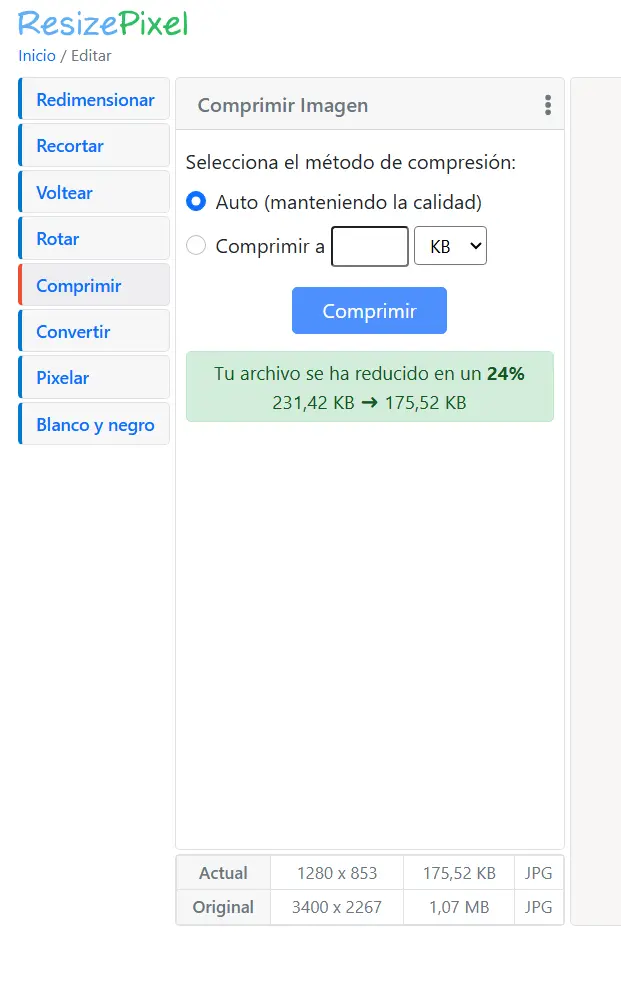 De todas las opciones que he probado al dia de hoy me quedo con Resize Pixel es un servicio gratuito online que me permite optimizar, recortar y optimizar mis imagenes guardando la mejor calidad posible.